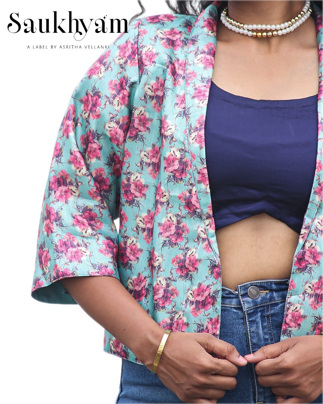 Add a burst of freshness to your wardrobe with this floral printed women’s crop jacket from Saukhyam by Asritha Vellanki. Crafted from premium, breathable fabric, this stylish jacket features a vibrant aqua-blue base with pink floral motifs, perfect for layering over casual or festive outfits.